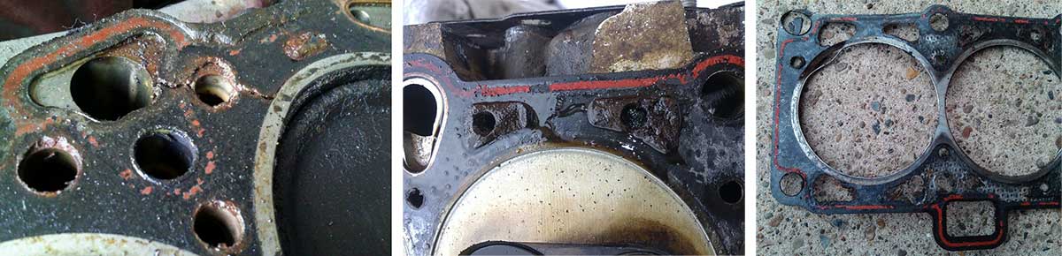 Крайний случай такого пробоя прокладки — прострел наружу. В этом случае двигатель будет работать очень шумно, и в месте пробоя, из-под головки будут идти выхлопные газы. Не понять то, что пробита прокладка, в этом случае просто невозможно.