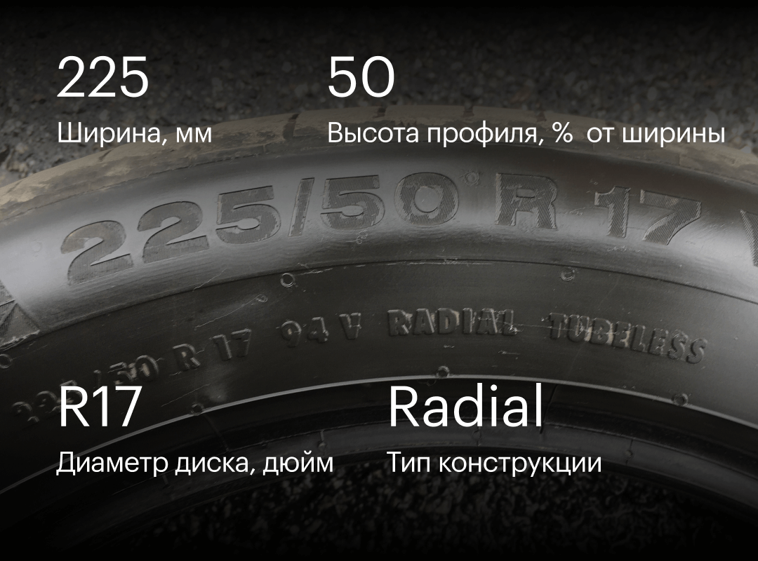 Размеры покрышек указывают в формате ххх/хх Rх. Они есть на боковине покрышки.