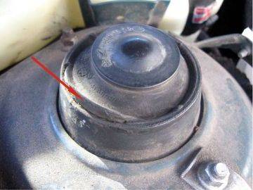 - Выполняя визуальный осмотр передней опоры под капотом, водитель может рассмотреть повреждения, появившиеся изменения во внешнем виде системы амортизации. Чаще всего выдает износ себя видом резиновых прокладок, они словно выпирают из отведенных для них пределов и посадочных мест.