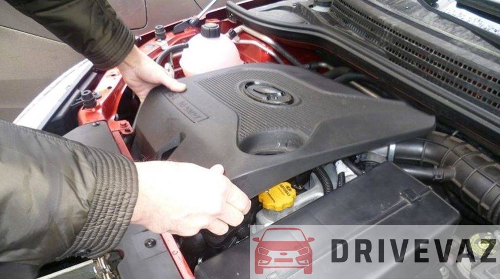 Процесс замены должен проводиться только после того, как мотор полностью остыл. Затем открывается крышка капота и снимается пластиковая крышка мотора.