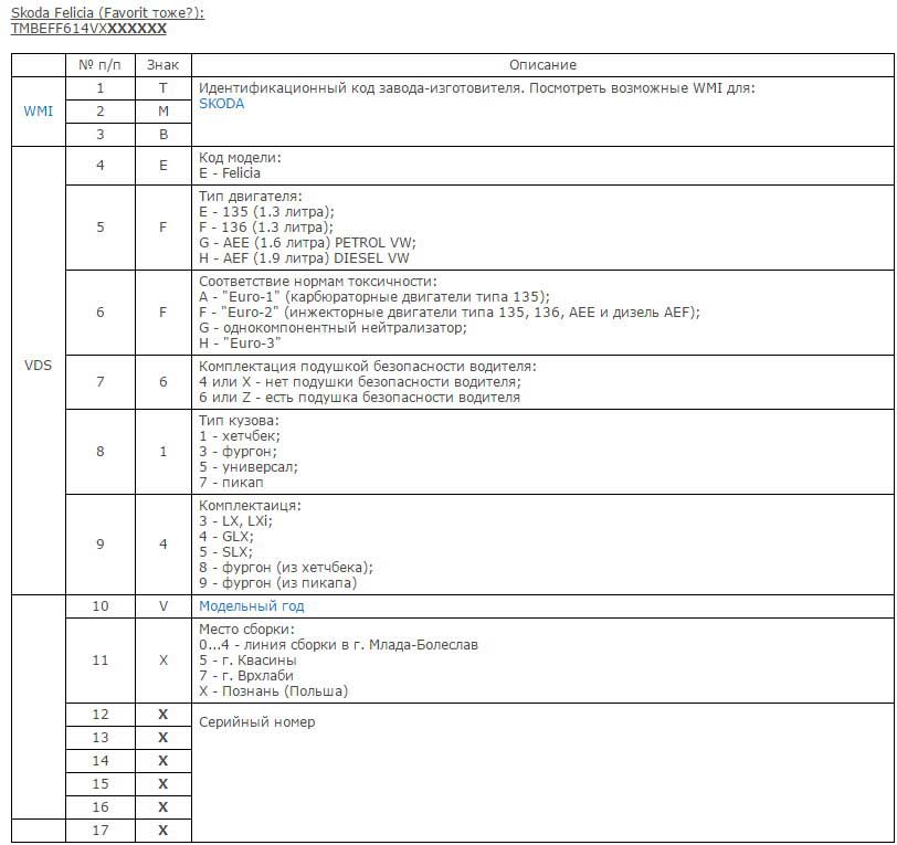 Для Skoda Felicia. Чтобы определить страну-производителя автомобиля, необходимо глянуть на 11-й символ кода:
