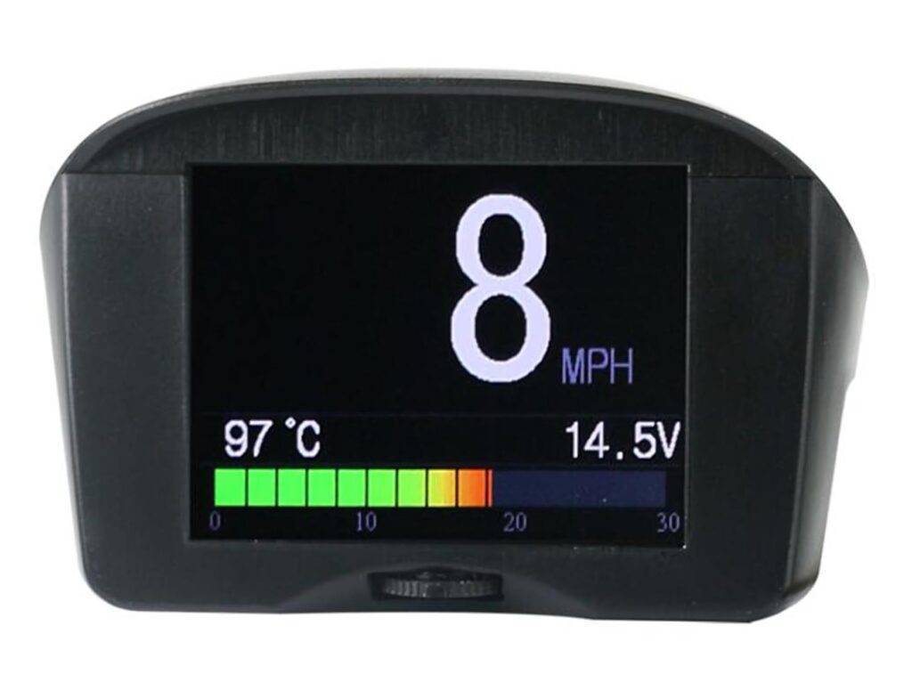 Автомобильный БК с 2,5-дюймовым дисплеем с разрешением 240×320 px. Большими цифрами выводит информацию о текущем и среднем значениях расхода топлива, скорости передвижения, частоте вращения вала мотора. Уведомит о температуре охлаждающей жидкости для контроля нагрева силового агрегата и напряжении на клеммах аккумуляторной батареи. Маленькие цифры ниже показывают угол открытия заслонки, сетевое напряжение и прочие сведения, доступные по протоколу OBDII.