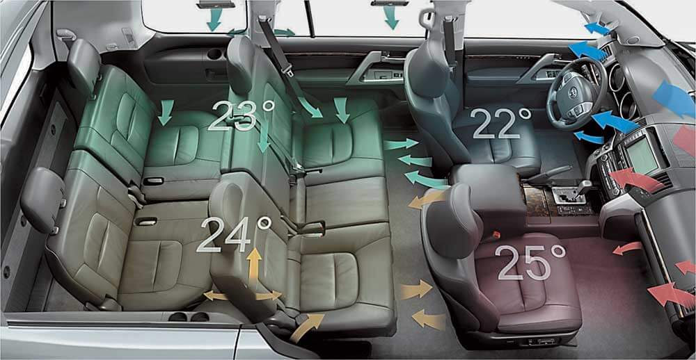 Важное отличие климатической системы от кондиционера – это способность создавать несколько зон микроклимата в салоне одного транспортного средства. Устройство климат-контроля может быть двух, трех или четырехзонной
