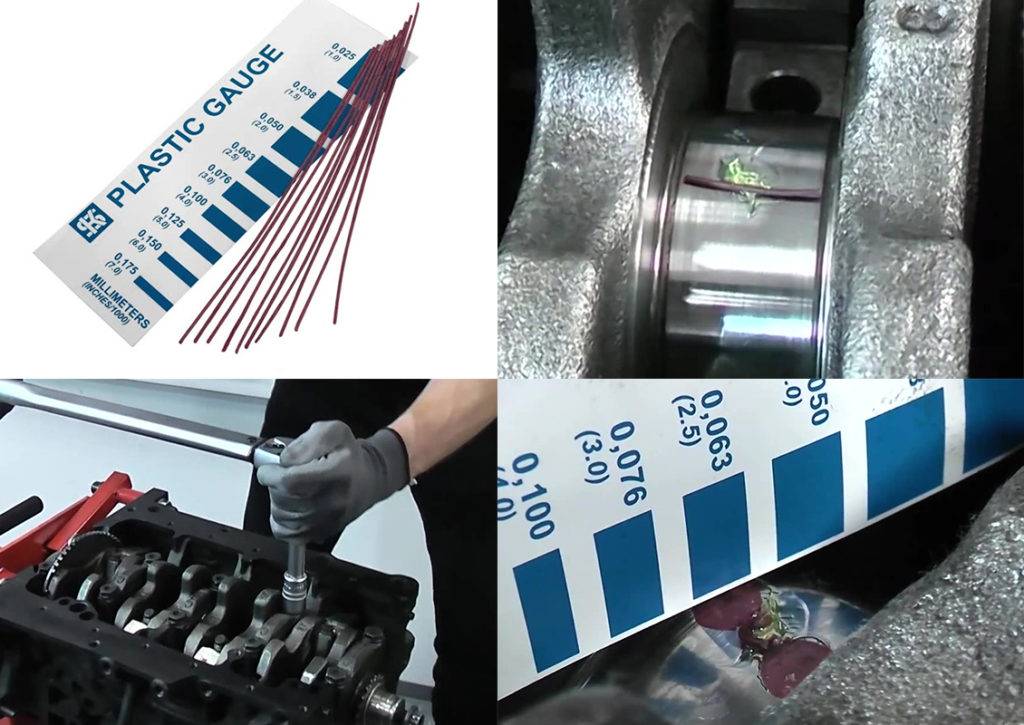 Для определения зазора между шейками коленчатого вала и подшипниками применяют калиброванную пластиковую проволоку и бумажный шаблон со специальной шкалой. Способ довольно прост и доступен. Кусочек проволоки устанавливают на обезжиренную поверхность шейки коленчатого вала. Для ее фиксации можно применить небольшое количество густой смазки. Затем шейка накрывается подшипником и крышкой. Крышки обтягиваются, проволока внутри раздавливается на плоскости шейки (резьбовые соединения нужно затягивать динамометрическим ключом). Болты раскручивают и снимают крышку. Далее остается измерить ширину расплющенной полоски шаблоном. Значение будет соответствовать достаточно точному значению зазора.