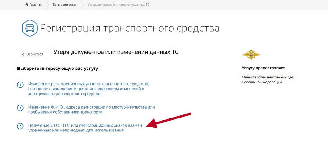 - Щёлкните «Услуги» → далее в разделе «Транспорт и вождение» отметьте «Регистрация транспортного средства» → «Утеря документов или изменения данных ТС» и щёлкните по услуге «Получение СТС, ПТС или регистрационных знаков взамен утраченных или непригодных для использования».
