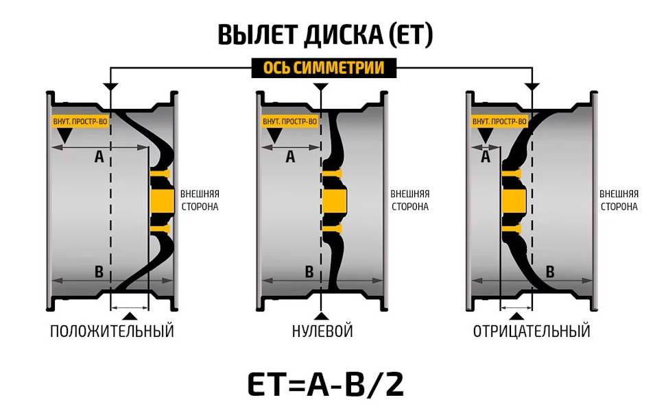 - Нулевой вылет — абсолютно ровная поверхность. Колесо равноудалено от центра машины. Обозначается ЕТ0