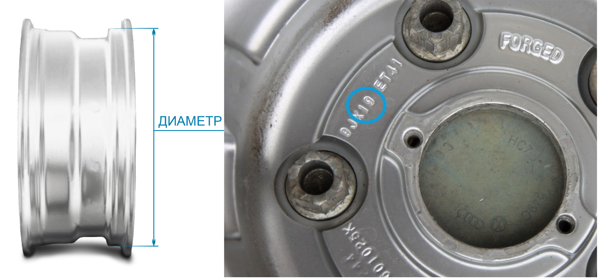 Вместе описанные ранее параметры составляют маркировку дисков автомобиля. Выглядеть она может следующим образом: 5,5Jx14 ET45 5×100 d58,1 либо 7Jx17 ET22 5×114,3 d66,1. Что означают эти цифро-буквенные значения, мы уже разобрали.