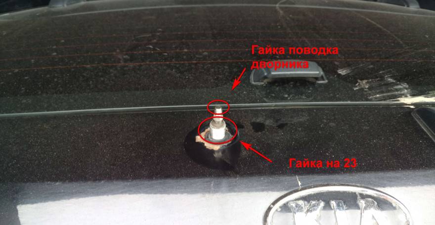Первым делом откручиваем гайку крепления дворника, она обычно ржавая, чтобы не сорвать обильно поливаем WD-40, затем снимаем дворник раскачивая его или используем съемник поводков стеклоочистителей. Дальше снимаем с оси моторчика стеклоочистителя резиновый сальник, под сальником откручиваем гайку на 23, теперь снаружи моторчик ничего не держит и можно открыть ляду багажника и разбирать с той стороны.