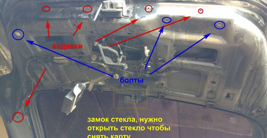 Разбираем заднюю дверь, для этого головкой на 10 откручиваем 2 болта крепления ручки и крестовой отверткой болт на левой стороне карты двери, выкручиваем 8 андапок (4 с нижней части двери, 2 по бокам и 2 со стороны стекла), срываем карту двери багажника с клипс. После этого карта будет болтаться, но чтобы снять ее нужно открыть окно двери багажника.