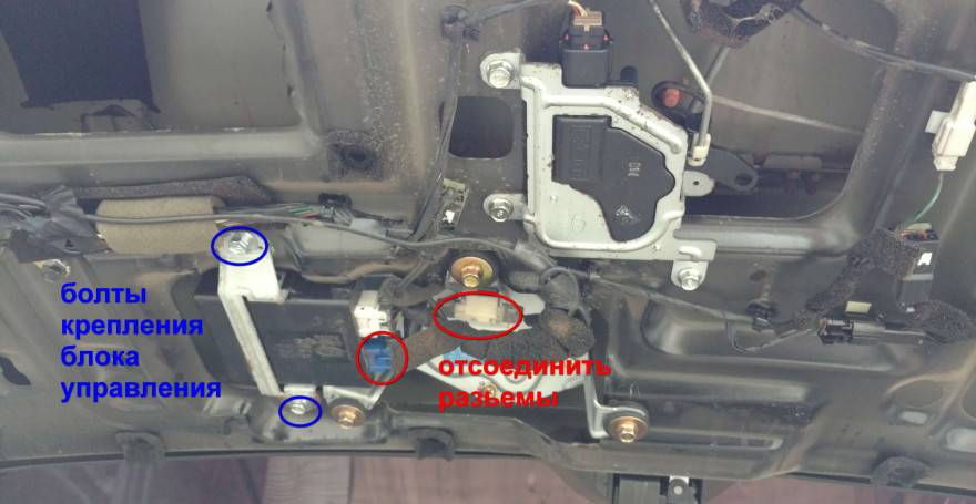 - Открыть кожух отсека предохранителей и демонтировать реле, которые закрывают доступ к креплениям мотор-редуктора.