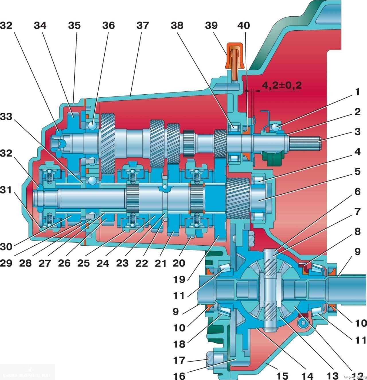 Коробка передач: 1 – подшипник выключения сцепления; 2 – направляющая втулка; 3 – первичный вал; 4 – роликовый подшипник вторичного вала; 5 – вторичный вал; 6 – стопорное кольцо; 7 – ось сателлитов; 8 – ведущая шестерня привода спидометра; 9 – заглушка транспортная; 10 – сальник привода колеса; 11 – роликовый конический подшипник дифференциала; 12 – шестерня полуоси; 13 – сателлит; 14 – коробка дифференциала; 15 – картер сцепления; 16 – ведомая шестерня главной передачи; 17 – пробка сливного отверстия; 18 – регулировочное кольцо; 19 – ведомая шестерня I передачи вторичного вала; 20 – синхронизатор I и II передачи в сборе; 21 – ведомая шестерня II передачи вторичного вала; 22 – стопорное кольцо; 23 – упорное полукольцо; 24 – ведомая шестерня III передачи вторичного вала; 25 – синхронизатор III и IV передачи в сборе; 26 – ведомая шестерня IV передачи вторичного вала; 27 – игольчатый подшипник шестерен вторичного вала; 28 – шариковый подшипник вторичного вала; 29 – упорная пластина; 30 – ведомая шестерня V передачи вторичного вала; 31 – синхронизатор V передачи в сборе; 32 – гайка; 33 – упорная шайба; 34 – ведущая шестерня V передачи первичного вала; 35 – задняя крышка картера коробки передач; 36 – шариковый подшипник первичного вала; 37 – картер коробки передач; 38 – роликовый подшипник первичного вала; 39 – сапун; 40 – сальник первичного вала