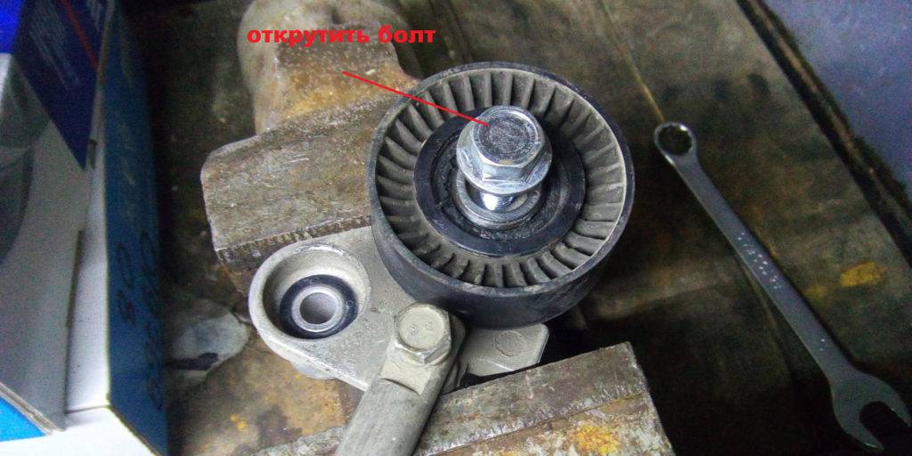 - Теперь натяжитель можно снять. Если его нужно заменить, устанавливать необходимо новый натяжитель в сборе или поменять/обслужить только ролик (будет рассмотрено ниже).