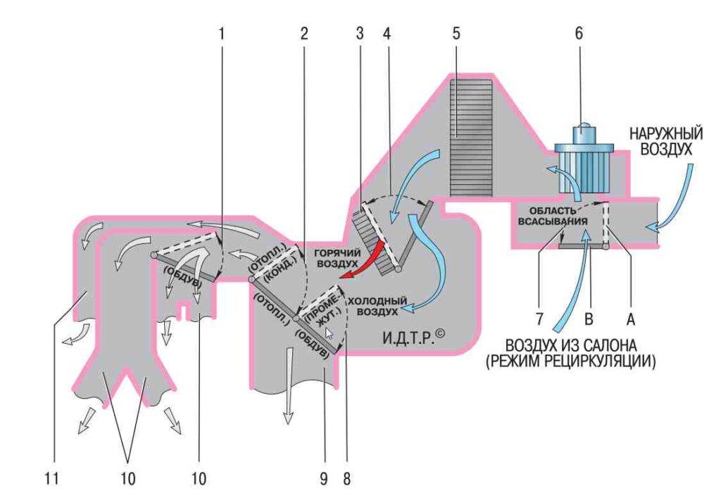 1 – заслонка отопитель/обдув стекол; 2 – верхняя заслонка распределения воздуха; 3 – теплообменник отопителя; 4 – заслонка регулятора температуры воздуха; 5 – теплообменник испарителя кондиционера; 6 – электродвигатель вентилятора (электропривод нагнетателя); 7 – входная заслонка; 8 – нижняя заслонка распределения воздуха; 9 – воздуховод кондиционера; 10 – сопла обдува ветрового стекла; 11 – сопло обдува боковых стекол; А – положение заслонки для подачи воздуха из салона; В – положение заслонки для подачи наружного воздуха