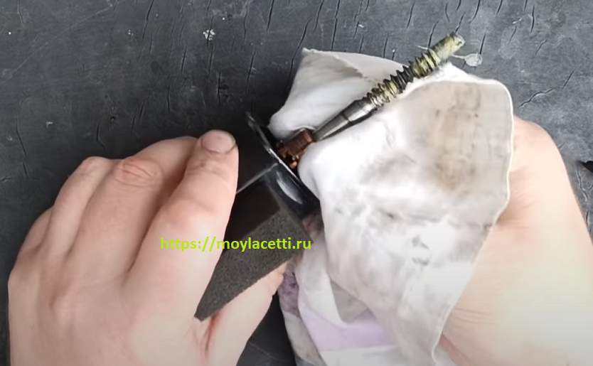 В общем, берем новую щетку и приступаем подгонять ее напильником. Делается это довольно быстро. Главное не переусердствовать и не сточить больше необходимого