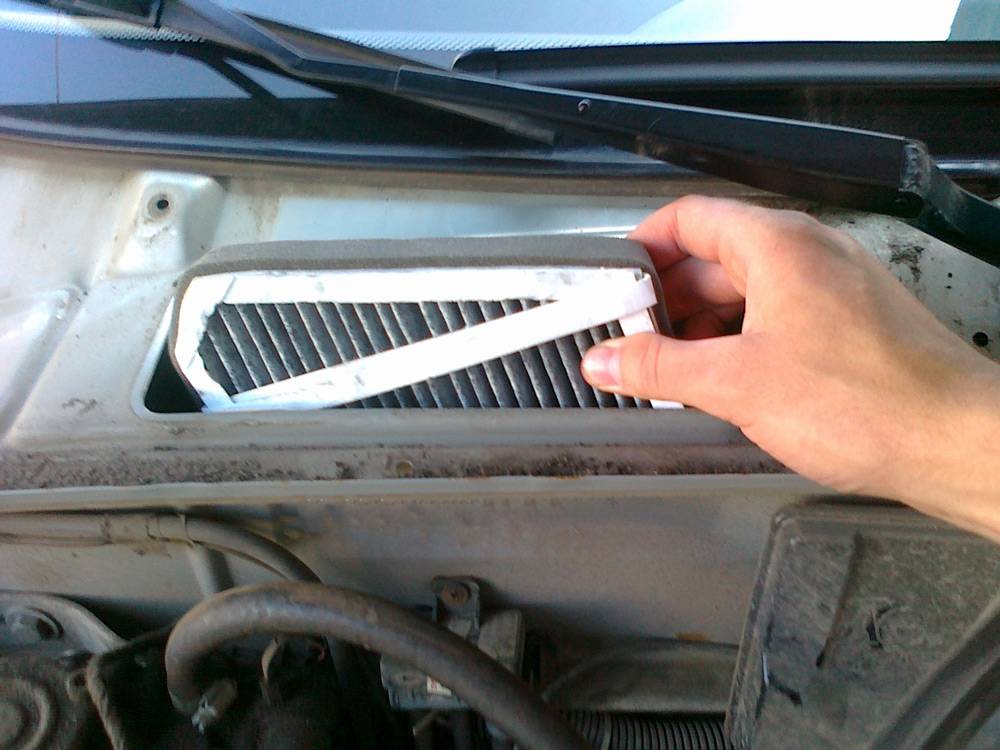 - Справа (по ходу движения) под лобовым стеклом установлен салонный фильтр, защищённый крышкой на защёлках. После снятия крышки и извлечения фильтра открывается доступ к вентилятору отопителя. Для доступа к вентилятору отопителя снимается салонный фильтр
