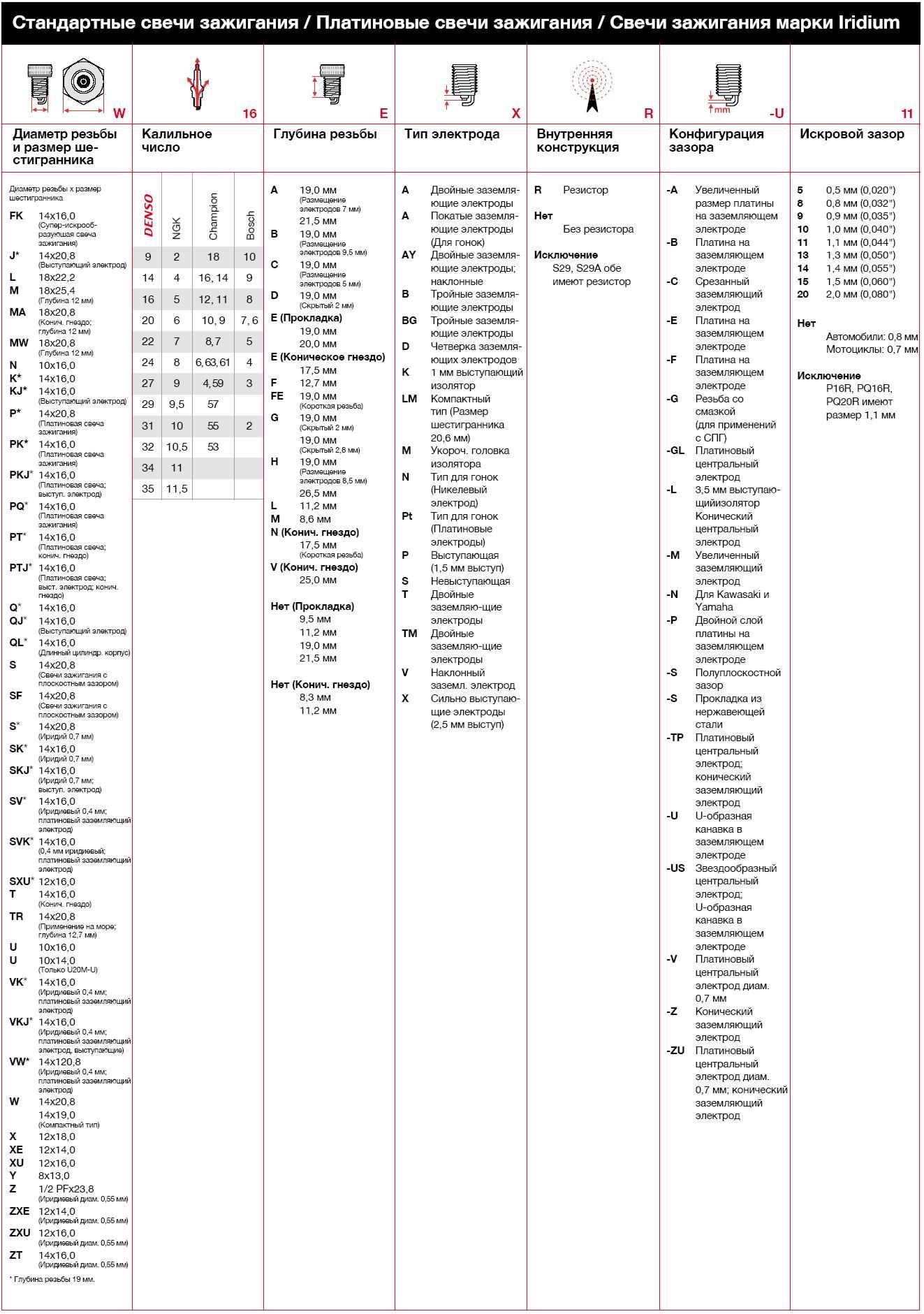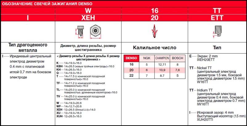 Каждый производитель использует свою схему кодирования параметров свечей. У Denso для новых серий принята следующая: