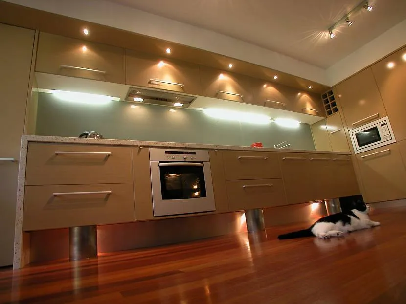 Кухня. Здесь не обойтись без качественной подсветки. В дополнение к стационарным на кухне неплохо установить и лампы с поворотным механизмом, возможно, парную модель.