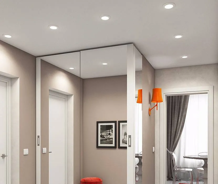 Прихожая (коридор). В скромном по размерам помещении споты прекрасно справляются с ролью основного источника света. Их монтируют в один или два ряда вдоль потолка.
