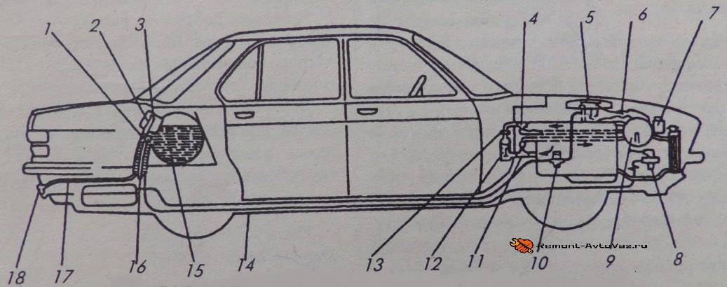 1 – вентиляционные трубки из гофры; 2 – герметичный корпус; 3 – контрольно-запорная и предохранительная арматура (мультиклапан); 4, 11 – тройники; 5 – смесительная проставка под карбюратор; 6 – дозатор; 7 – блок управления; 8 – газовый электромагнитный клапан; 9 – редуктор; 10 – бензиновый электромагнитный клапан; 12 – радиатор системы обогрева салона; 13 – кран радиатора обогрева; 14 – магистраль высокого давления; 15 – газовый баллон; 16 – эжекторы; 17 – переходной патрубок; 18 – заправочный вентиль.