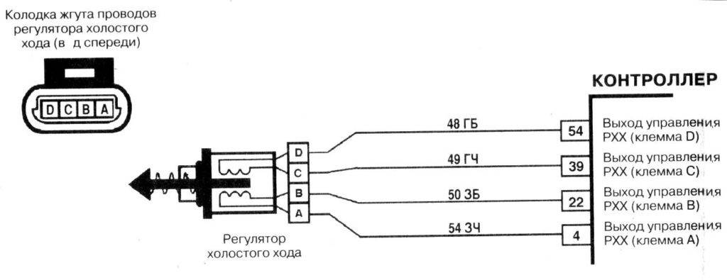 Для начала необходимо проверить цепь питания датчика. Для этого снимаем разъем с РХХ и включаем зажигание на автомобиле, на мультиметре выставляем переключатель на измерение постоянного напряжения величиной 20В. Подключаем один щуп мультиметра к корпусу двигателя, а другой к выводу А на разъеме, мультиметер должен показать напряжение не менее 12В. Затем подключаем щуп к выводу D мультиметр так же должен показать не менее 12В.