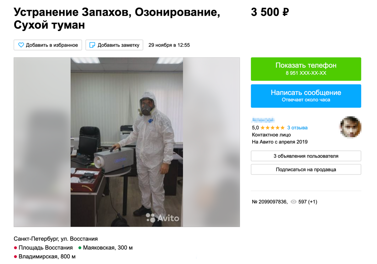 Услуга «сухой туман» на «Авито» за реалистичную цену. Ичточник: avito.ru