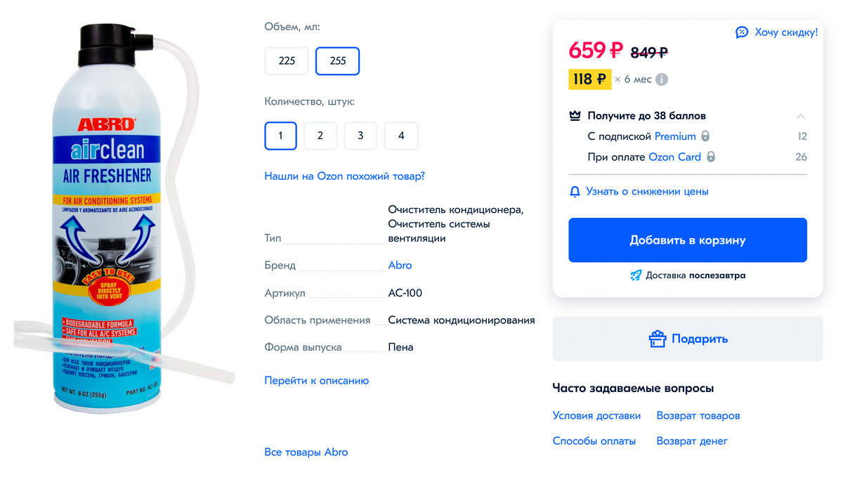 Состав для чистки испарителя Abro. Ичточник: ozon.ru