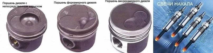 Дизели отличаются своими поршнями. Их форма диктуется разновидностью к/с и по ней просто выявить для какого двигателя предназначен этот поршень.К/с обычно располагается в поршне, верх которого, достигая ВМТ, выступает выше плоскости блока цилиндров.