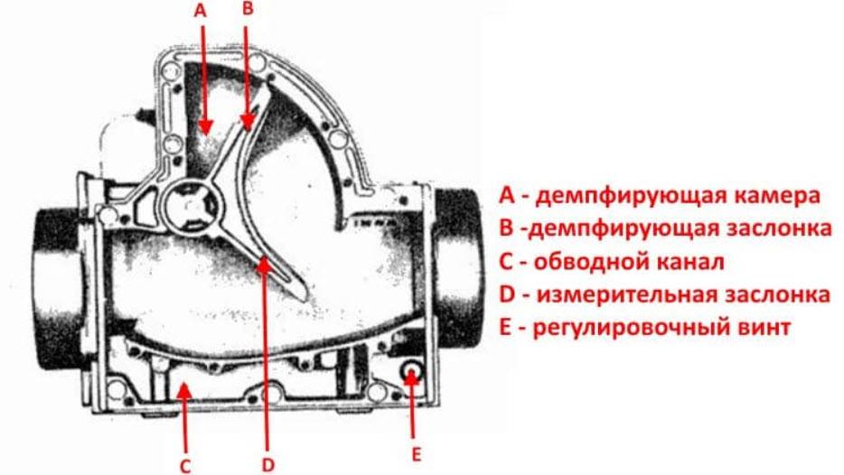 В общем случае датчик имеет в своем составе два устройства: датчик температуры и нагревающуюся нить из тугоплавкого материала. Принцип работы ДМРВ прост.