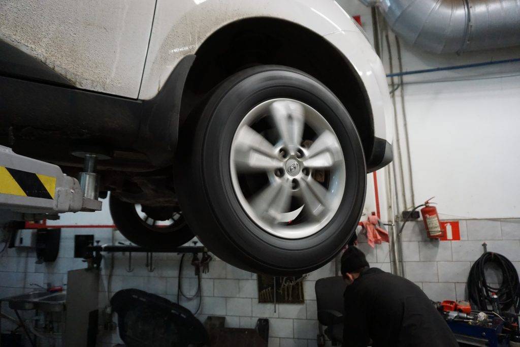 - При помощи подъемника или домкратов ведущие колеса автомобиля вывешиваются в воздух.