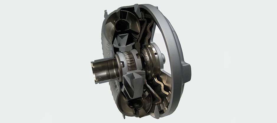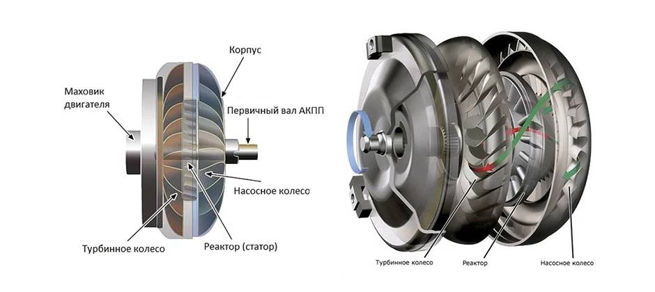 Насосное колесо соединено с коленвалом двигателя, а турбинное колесо – с планетарным редуктором через вал. Между колесами расположен реактор. Колеса и реактор оснащены лопастями определенной формы Все элементы гидротрансформатора собраны в одном корпусе, который заполнен жидкостью ATF.