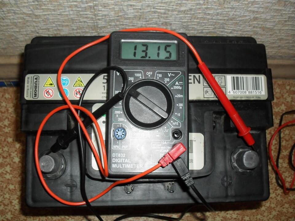 Проверка аккумулятора автомобиля мультиметром включает в себя подключение сразу двух щупов. Мотор перед измерением также заглушите.