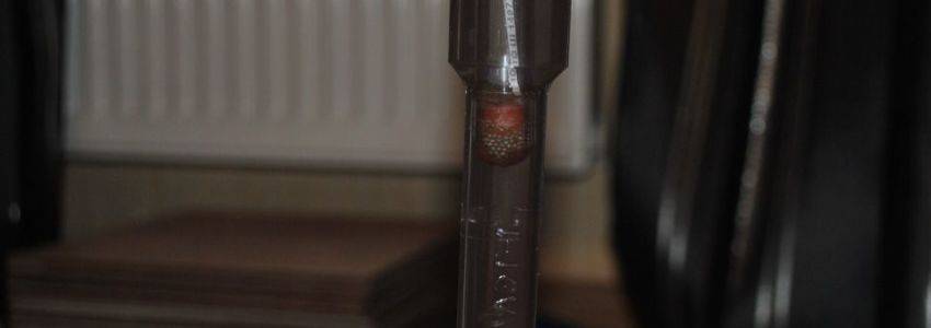 - При низком уровне электролита высокая плотность. Требуется долить дистилированную воду, размешивая электролит стеклянной палочкой. После работы измеряем плотность.