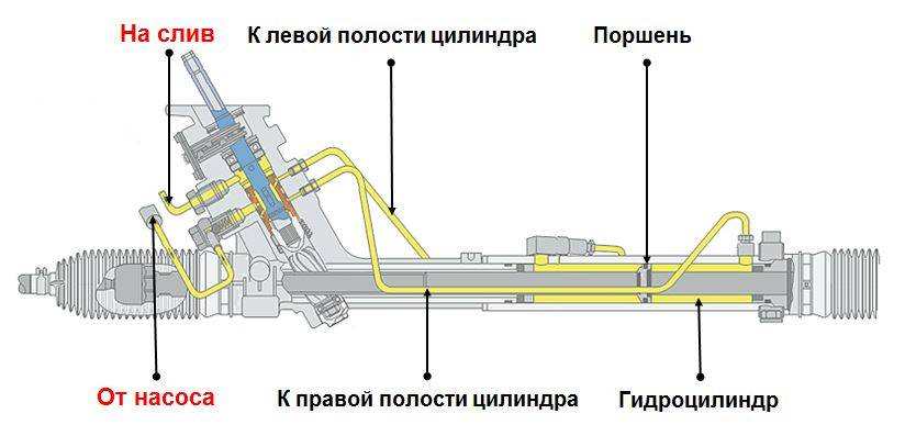 Гидроусилитель руля устанавливается на рулевой механизм любого типа. Для легковых автомобилей наибольшее распространение получил реечный механизм. В этом случае схема ГУР следующая: