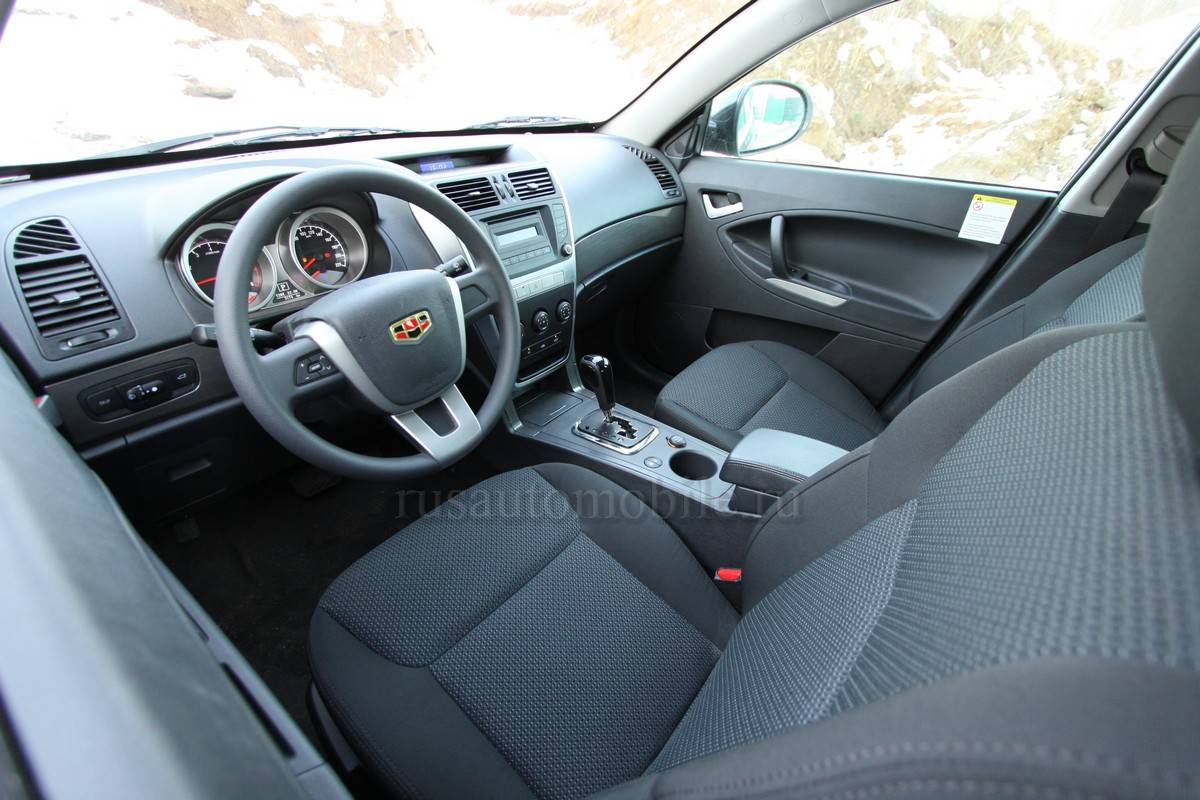 Салон Emgrand X7 встречает водителя и четверых пассажиров строгой и сдержанной атмосферой, бюджетными материалами отделки. Оформление внутреннего пространства выполнено в черно-бежевой гамме. Рулевое колесо с регулировкой только по высоте. Приборы располагаются в двух колодцах и имею приятную голубую подсветку. Второй ряд радует не только запасом пространства для комфортного размещения троих взрослых пассажиров, но и возможностью двигать раздельный задний диван вдоль салона, увеличивая размеры багажного отделения или места для ног пассажиров. С пятью членами экипажа багажник Geely Emgrand X7 способен разместить 570 литров груза, если сложить задний ряд сидений, образуется практически ровная грузовая платформа объемом 1200 литров. Запаска крепится под днищем автомобиля.