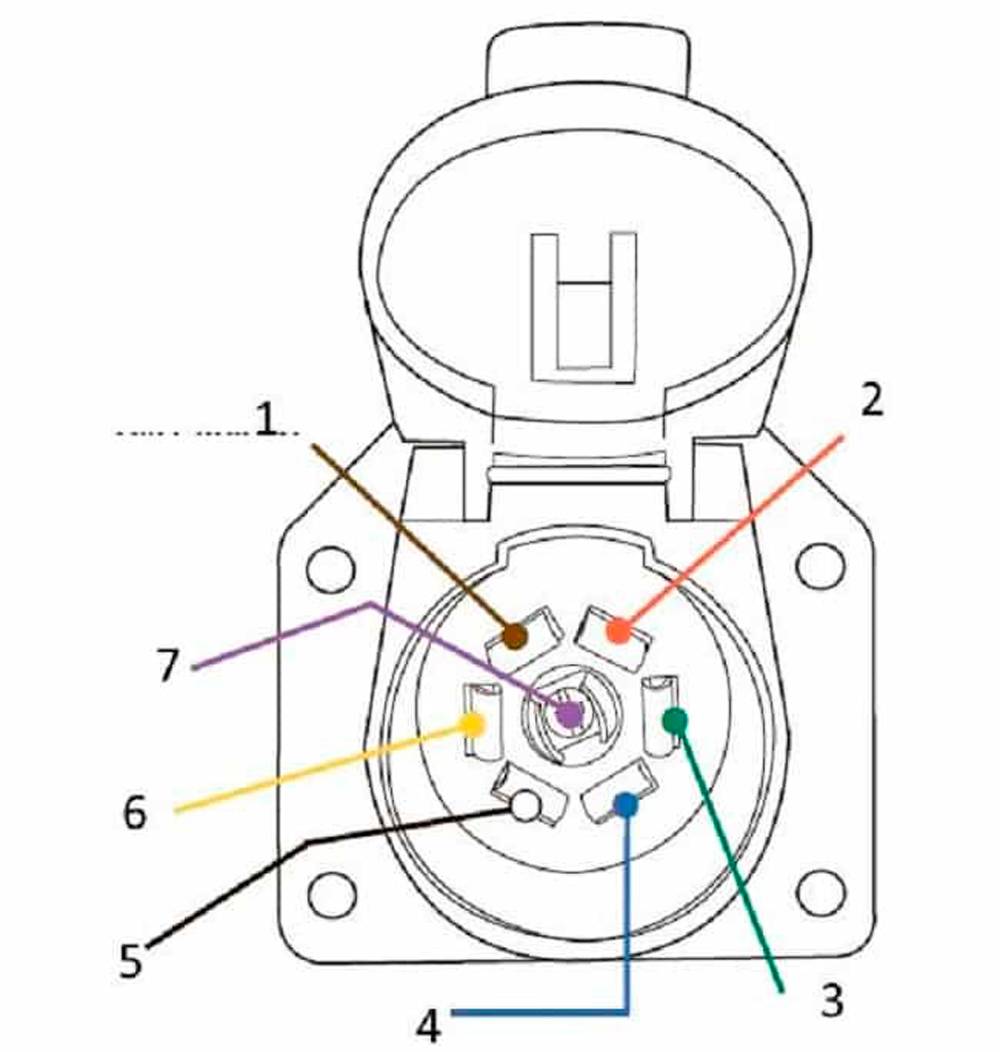 Розетка фаркопа на семь разъёмов имеет состав распиновки следующий: