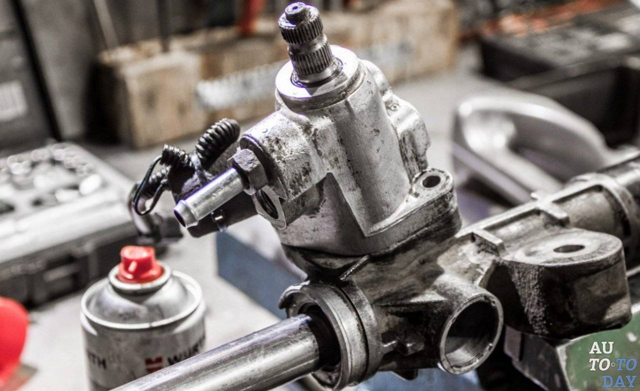 Чтобы вытащить вал, нужно открутить защитные кожухи (при наличии) и шайбу регулировки шестеренчатой передачи, предварительно наметив ее положение. Затем извлекаются оба вала – ведущий рулевой и реечный. В последнюю очередь аккуратно выбиваются полимерные втулки и сальники (удерживаются стопорными кольцами). По окончании корпус тщательно вымывается.