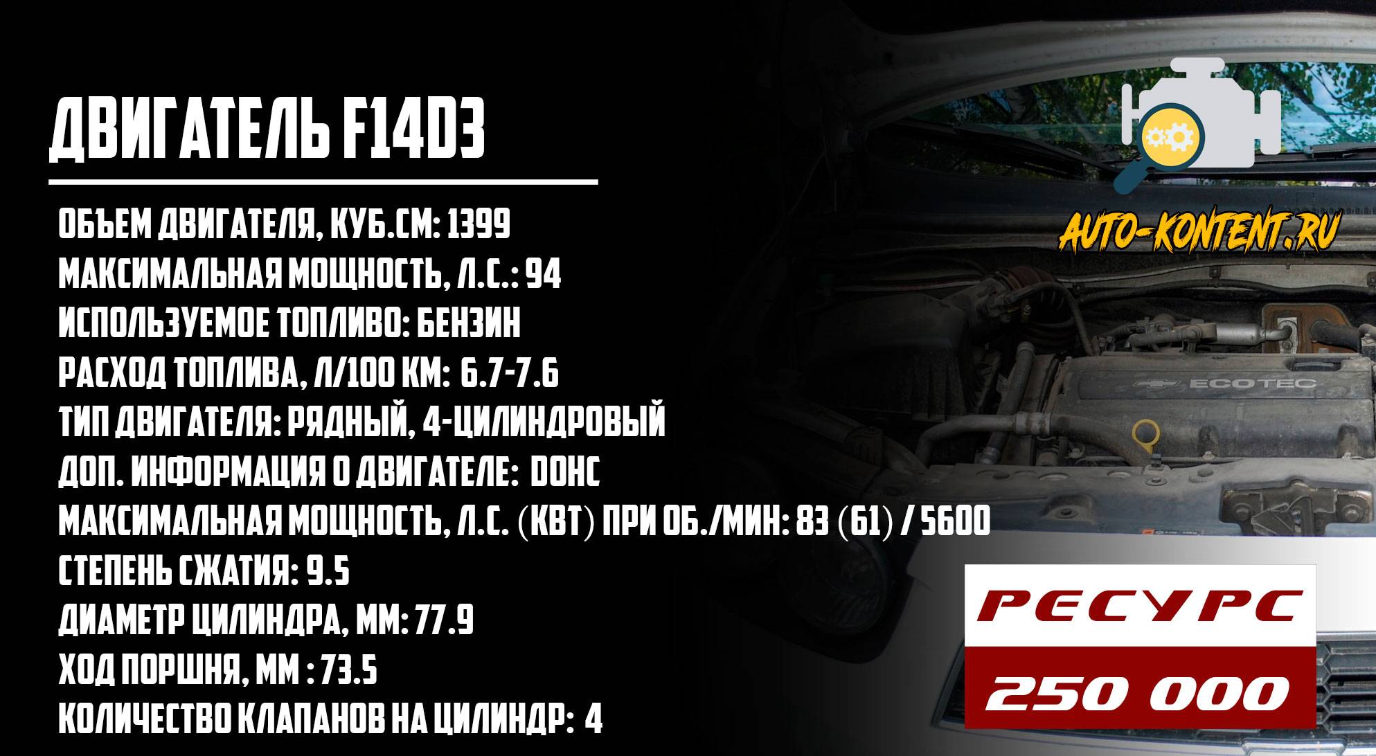 - F14D3 – это мотора с рабочим объемом 1.4 литра, но уже на 94 лошадиные силы;