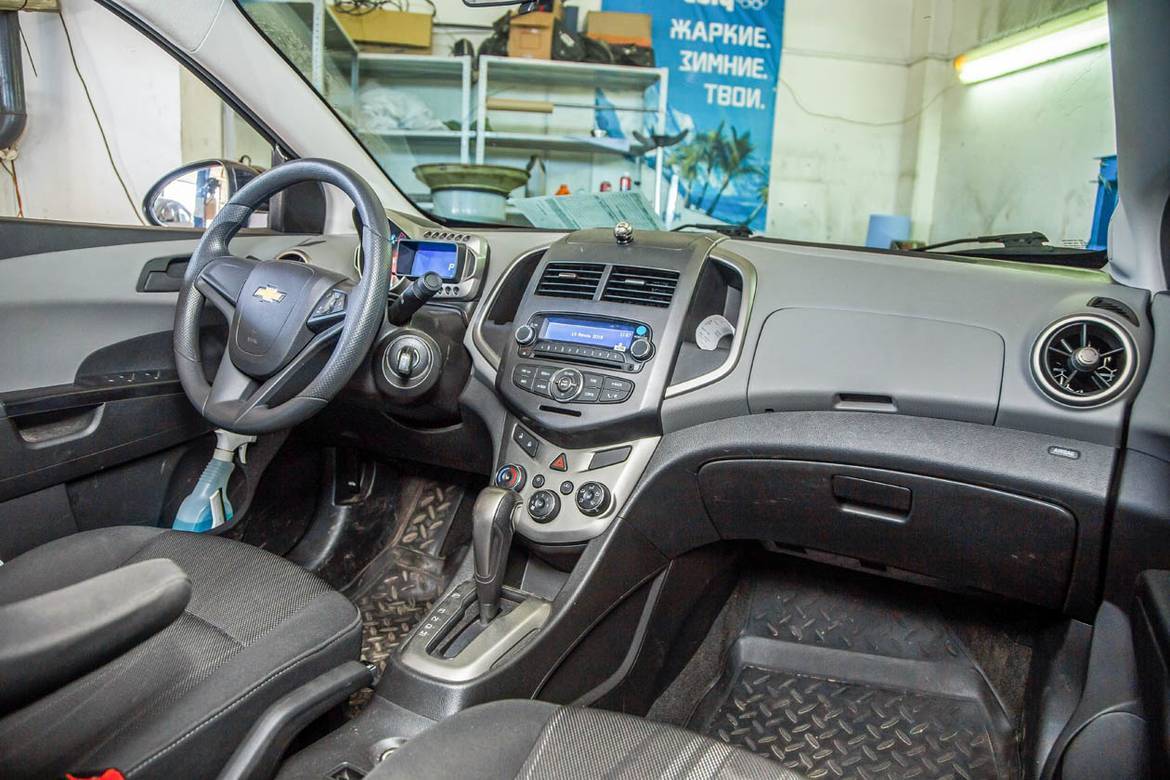 Внешний эффектный вид и в целом переход на более дорогое позиционирование Chevrolet Aveo II не избавил машину от всесторонней экономии. В частности, вся пластмасса в салоне, несмотря на экстравагантный дизайн, недорогая и жесткая, подверженная со временем скрипам и сверчкам. Окрашенные части интерьера очень легко царапаются.