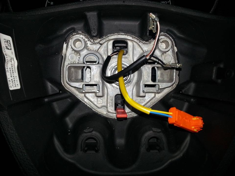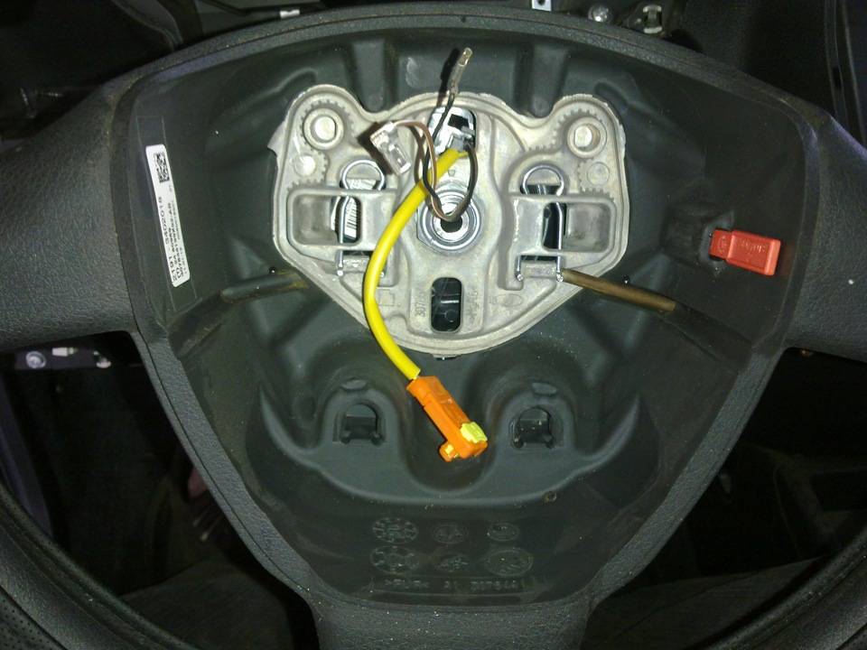 Отсоедините два провода звукового сигнала. Затем возьмите тонкую плоскую отвертку или нож. Подденьте маленький жёлтый фиксатор на оранжевом разъёме подушки.Он должен немного отойти вперёд. Далее снимите разъём и отложите подушку в сторону. Откроется вот такой вид: