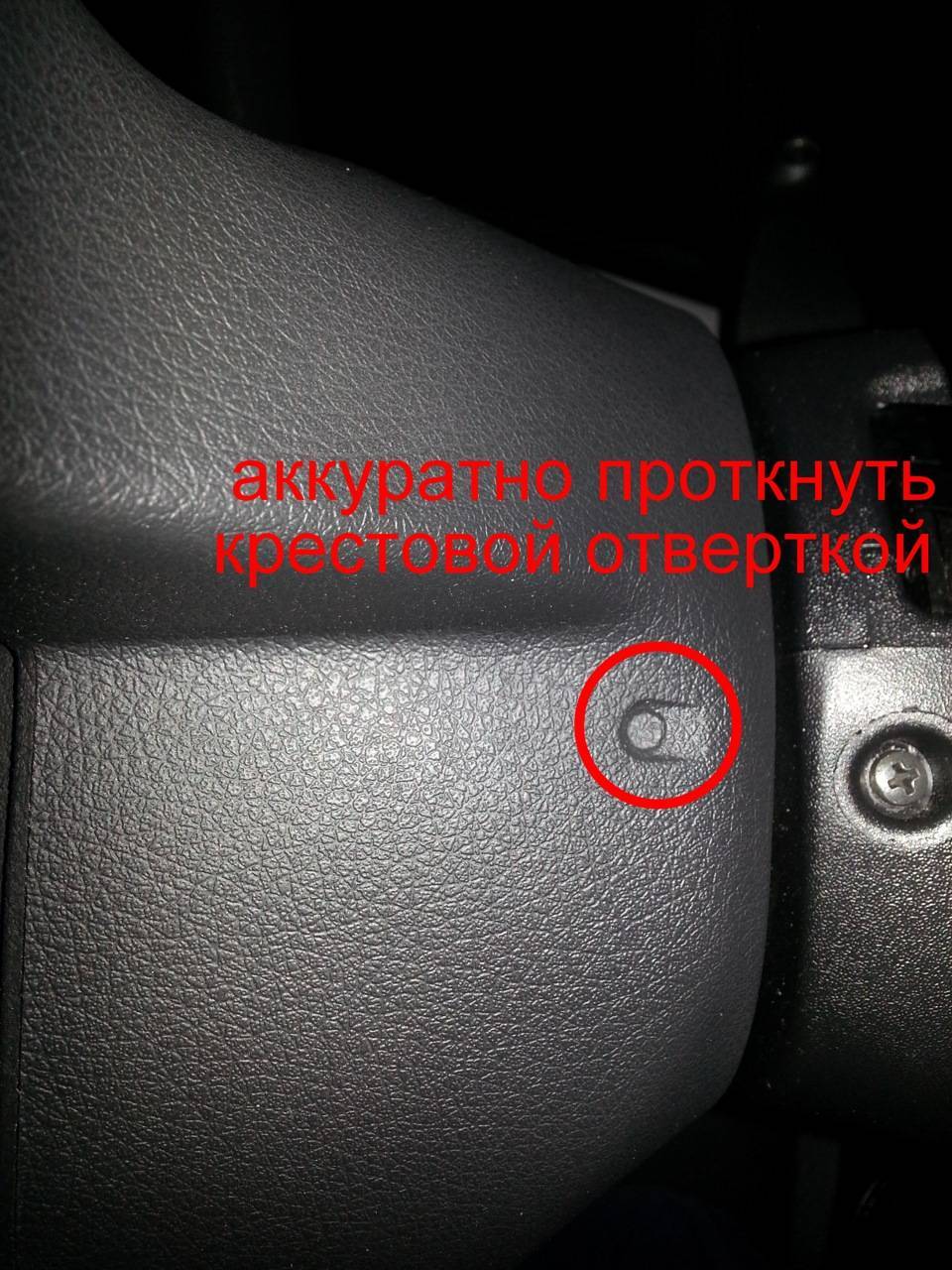 Для того чтобы их сжать, на руле есть два отверстия. Они расположены по бокам рулевого колеса. Если ранее руль не снимался, эти отверстия будут запакованные (что-то типа пломбы).