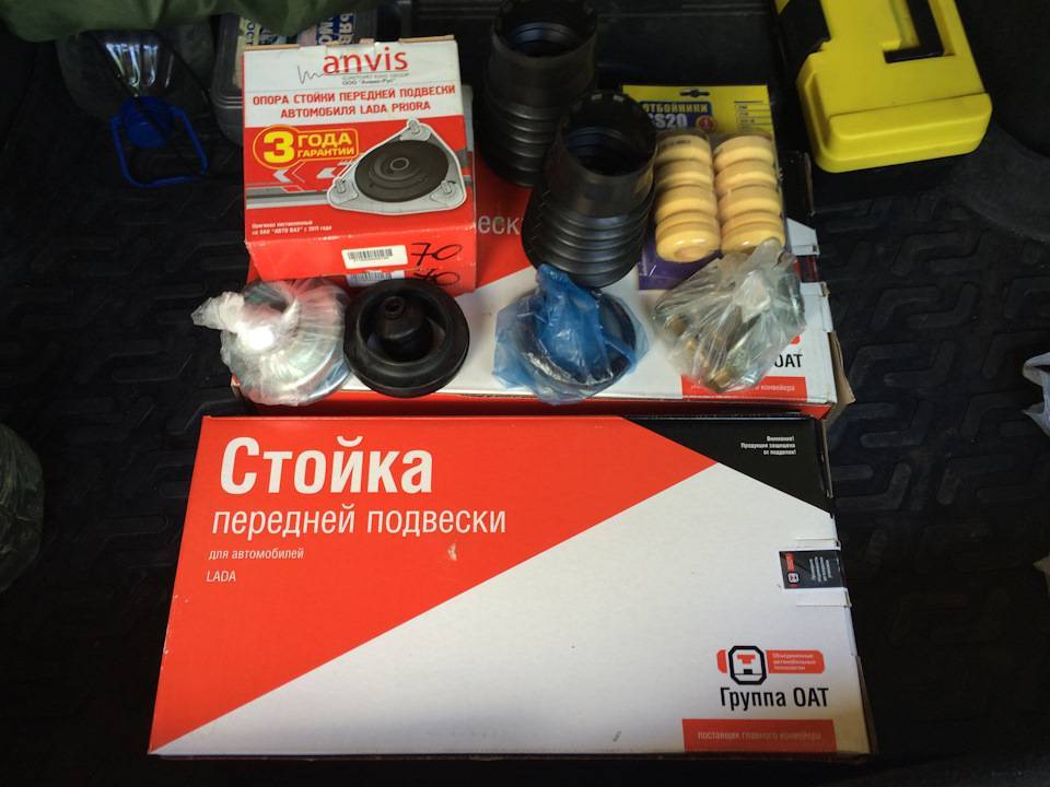 Заменены:1) 2170-2905402-50 правая стойка (ТД ОАТ) 2417р2) 2170-2905403-50 левая стойка (ТД ОАТ) 2417р+комиссия сбера 121р3) Подшипник опоры передней подвески SKF (Самара АВТОЛЮКС) 740р4) Пыльник передней стойки Балаково (АВТОЛЮКС) взял от 2110, 2110-2905681 2шт=400р5) Отбойник передней стойки СС20 стандарт, говорят покрепче (АВТОЛЮКС) 2110-2902816 330р6) Ограничитель хода/сжатия передней подвески (АВТОЛЮКС) 2170-2902834 4шт=120р7) Болт+гайка М12 (АВТОЛЮКС) 2+2=44р8) Развальный болт с шайбой и гайкой (АВТОЛЮКС) 2шт=96 рублей (з.ы. в автокрепеже один болт 100 рублей стоит)9) Шплинт для гайки рулевой тяги (АВТОЛЮКС) 2шт=4рТак же брал и сдал обратно запчасти, из-за того что старые были в хорошем состоянии.1) Опоры АНВИС с подшипником SKF (АВТОКРЕПЕЖ) 21700-2902821-85 2шт=2600р2) Прокладка пружины передней (АВТОЛЮКС) 2170-2902723 2шт=120р3) Пыльник рулевого наконечника, при съеме стойки могут порвать (АВТОЛЮКС) 2108-3414077 2шт=50р