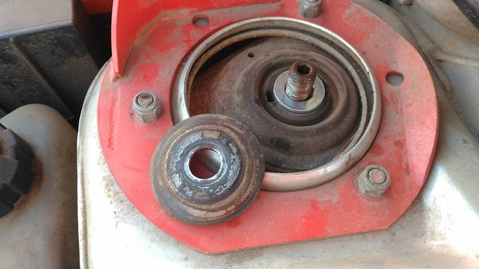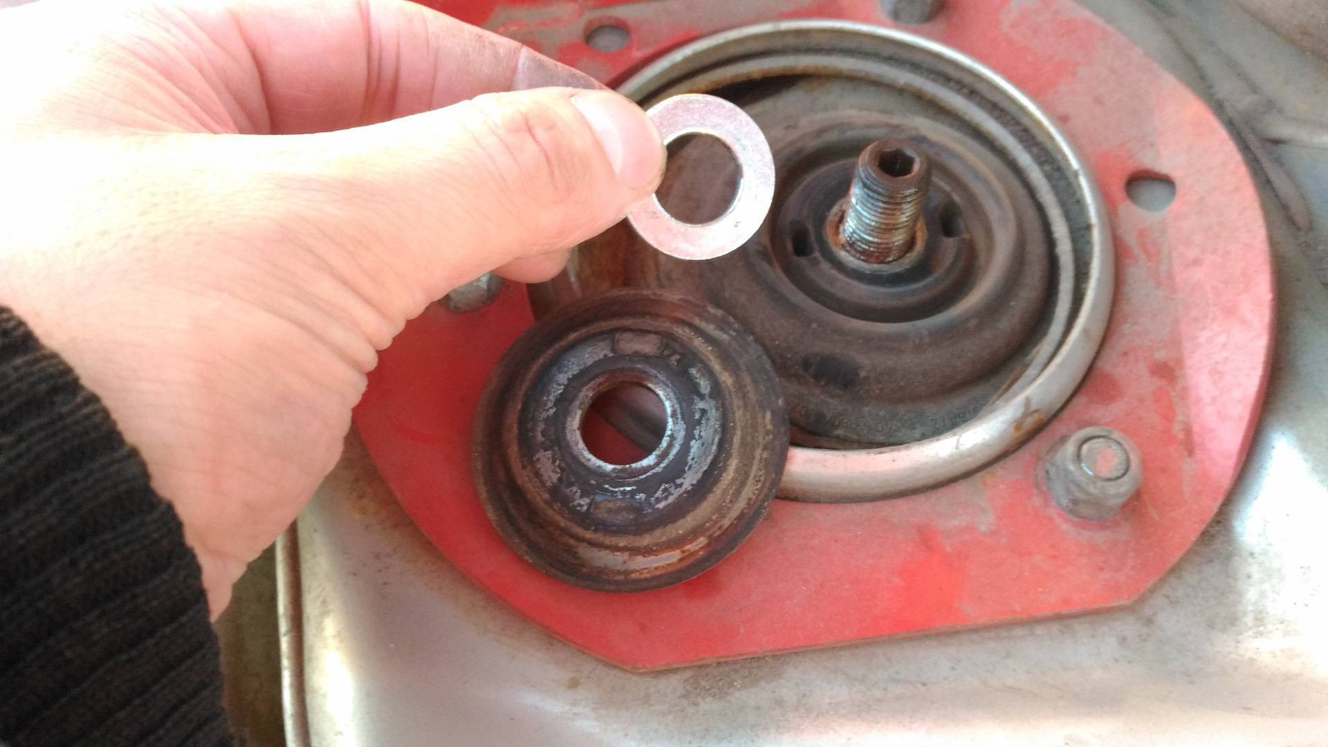 Всё, что нам потребуется, — это купить пару толстых шайб с внутренним диаметром около 14 миллиметров. Стоят такие детали по 10-20 рублей. Доработка происходит очень просто и быстро. Придерживая шток стойки, откручиваем гайку крепления опорного подшипника, снимаем тарельчатый ограничитель и подкладываем под него шайбу, затем всё собираем. Точно такую же операцию проводим и с другой стороны.