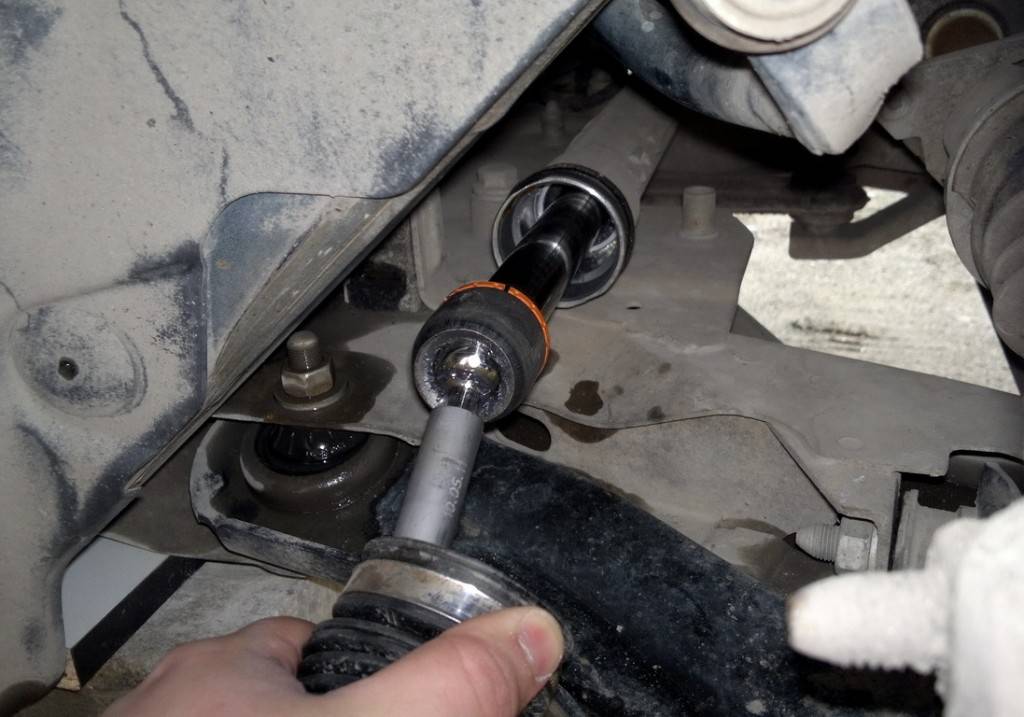 Если хотите выполнить снятие с рулевыми тягами, от поворотного рычага амортизаторных стоек открутите наконечник тяг. Для этого придется выполнить такую работу: