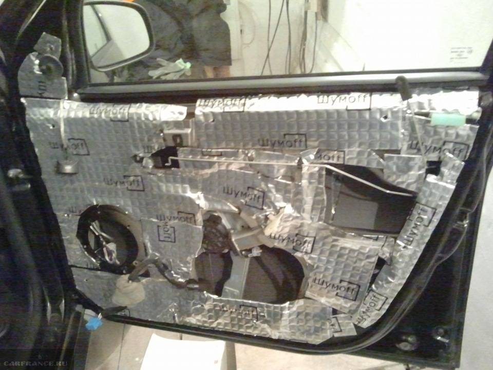 - С двери необходимо сначала снять все декоративные панели и обшивку, которыми закрыта внутренняя поверхность, затем, через технологические отверстия, отмываете и обезжириваете поверхность, потом наклеиваете виброизоляцию
