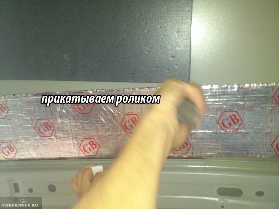 - Берете полоску вибропоглощающего материала (чтоб проходила без затруднений через технологическое отверстие), снимаете защитный слой, прогреваете, прикладываете и прикатываете при помощи валика