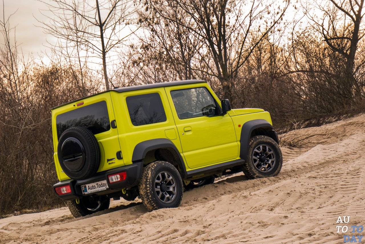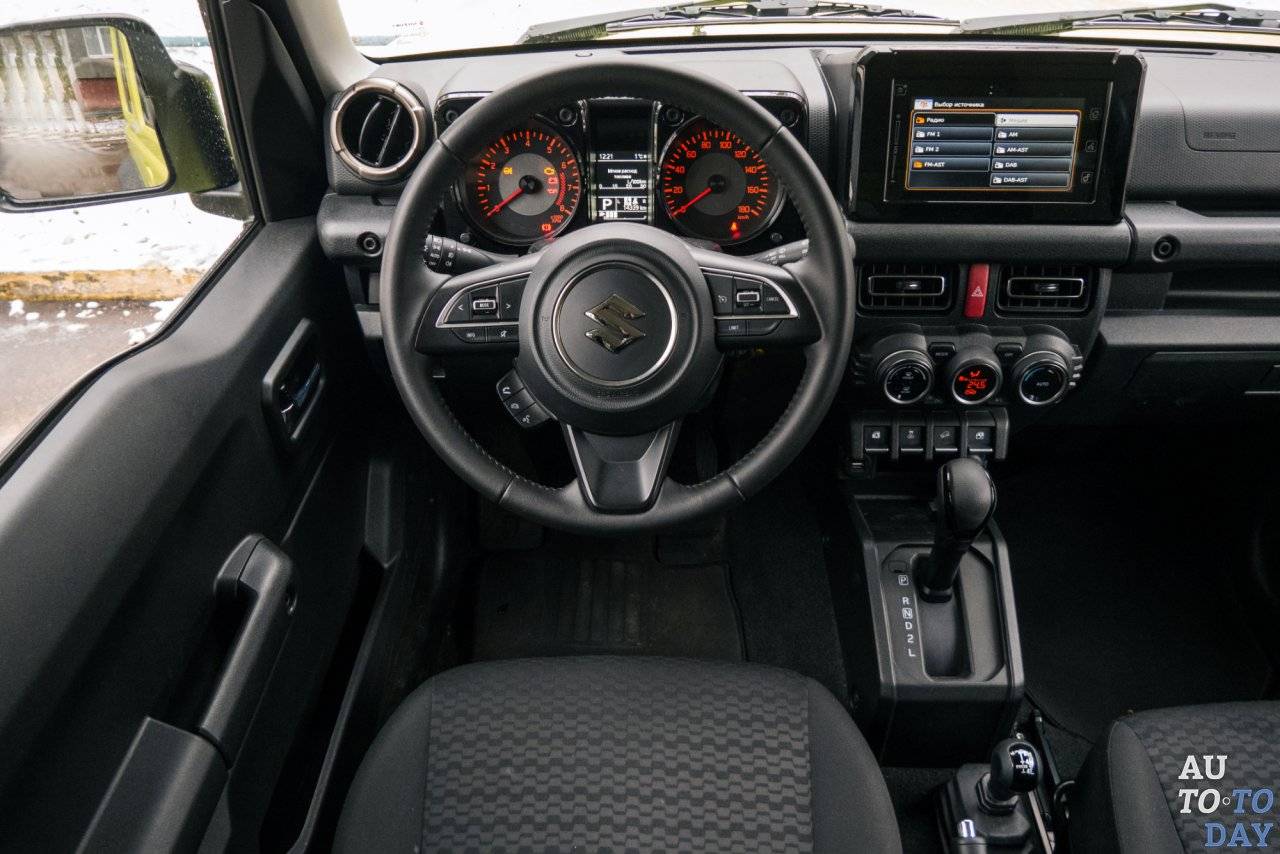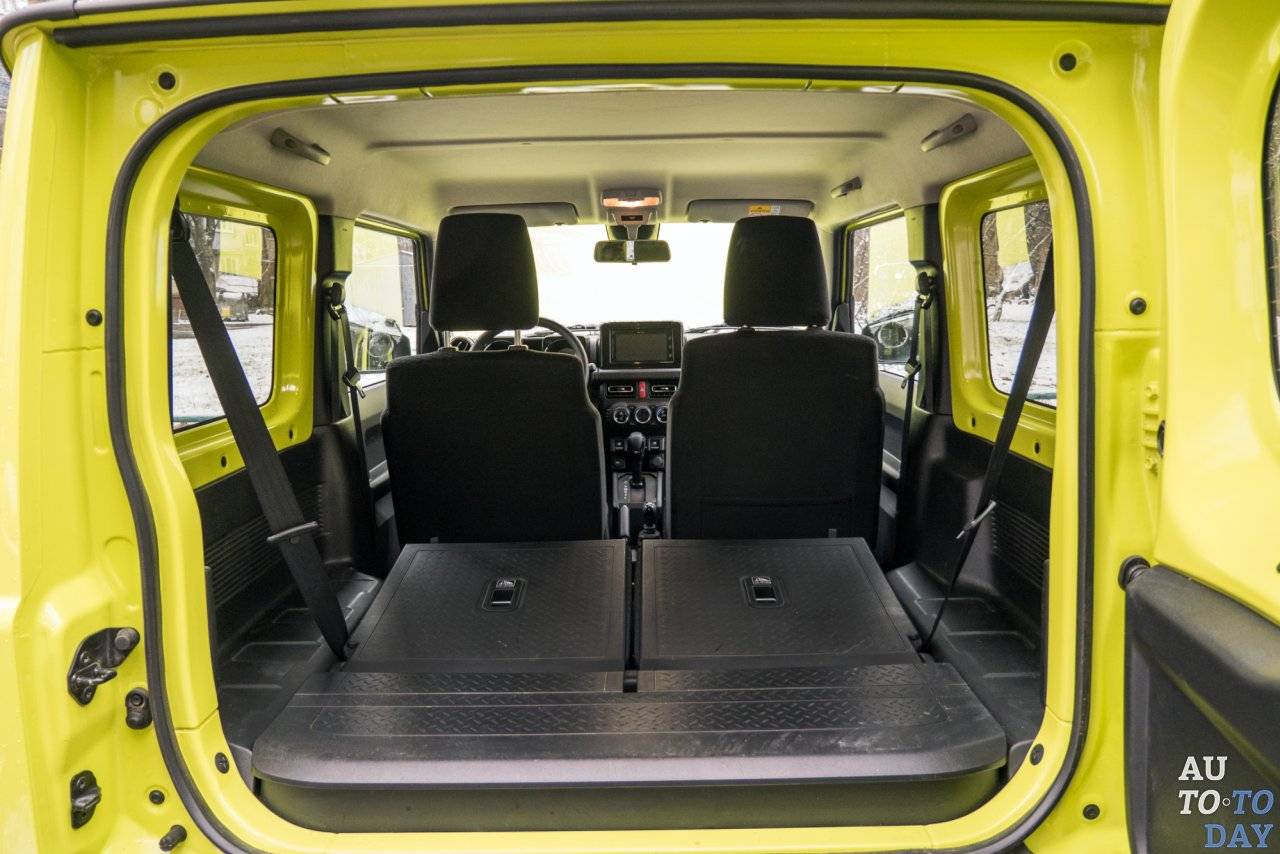 Положение за рулем подходит для всех — даже высокий человек может быстро выбрать удобные настройки для вождения, несмотря на одноосевую (вверх-вниз) регулировку рулевого колеса. Хорошая видимость во всех направлениях — результат прямых линий корпуса. Новый Джимни после складывания спинок занимает 377 литров. Пол плоский, а упаковка легче с более широким отверстием (от 1,3 м до 918 см от предшественника). С точки зрения простора, новый Джимни напоминает однокомнатную квартиру: двоим вполне комфортно, но когда есть гости приходится потесниться…