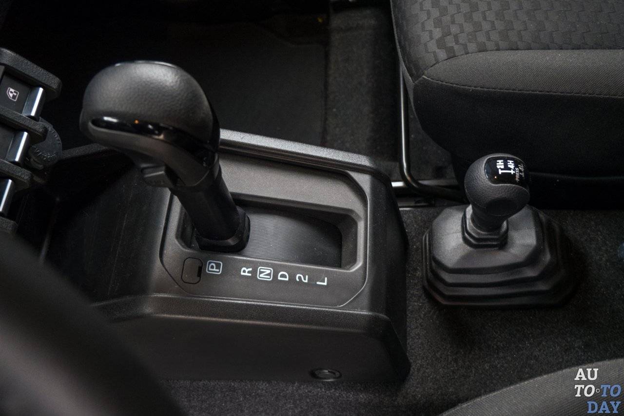 Полный привод Suzuki Jimny имеет название All Grip Pro. При обычных условиях это заднеприводная машина, а передний мост надо включать только на серьезном бездорожье. Ведь в машине не предусмотрен ни межосевой, ни міжколісні дифференциалы. Для преобразования этого симпатяги в брутального внедорожного монстра в салоне есть рычаг раздатки, который имеет два положения – 4H и 4L. Чтобы включить передний мост, останавливаемся и переводим рычаг АПК в нейтраль. При этом никакой индикации на панели приборов нет. А если переводить раздатку в режим 4L, то рычаг надо еще и немного утопить. При этом ощутимо характерный «железный» звук, а на панели загораются лампы отключения электронных систем – ESP и тому подобное. Однако системы, которые работают на бездорожье, работают.