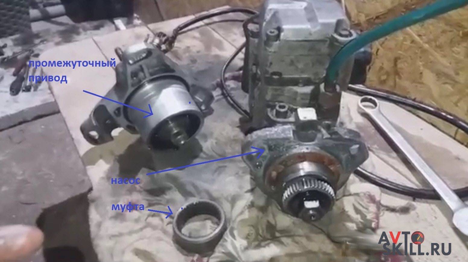 На машинах с дизелем сначала устанавливается промежуточный фланец с приводом. При этом часть с пазами ставят в регулировочный механизм насоса. Регулировочный болт будет находиться внутри паза.