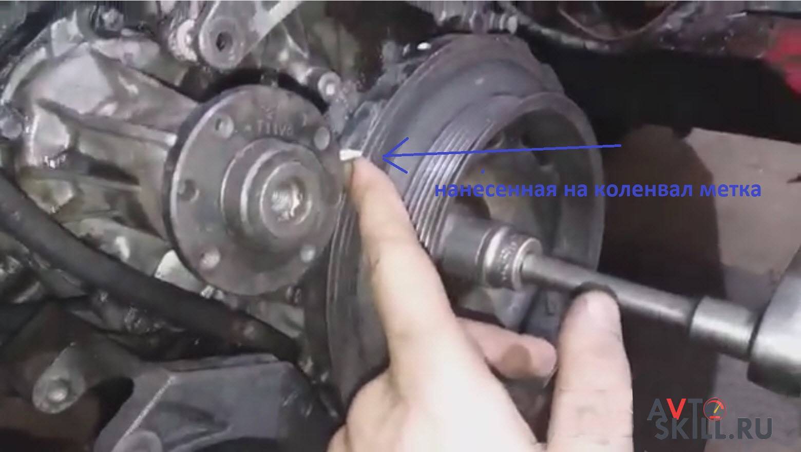 Если индикатор отсутствует, двигатель нужно прокручивать вручную на 15 градусов до верхней мертвой точки на первом цилиндре. Два кулачка распредвала должны оказаться направлены вверх. Они будут немного не доходить до ВВТ, на шкиве будет 15 градусов до ОТ. То есть, первый поршень на первом цилиндре начинает сжатие, и в этом момент происходит впрыск. Если шкалы с градусами нет, придется повернуть коленвал на глаз и поставить метку.