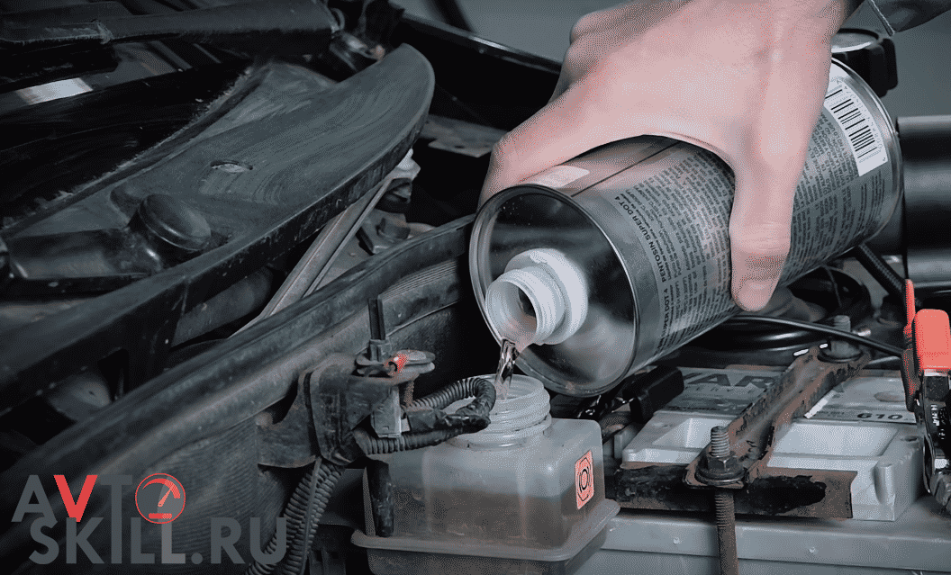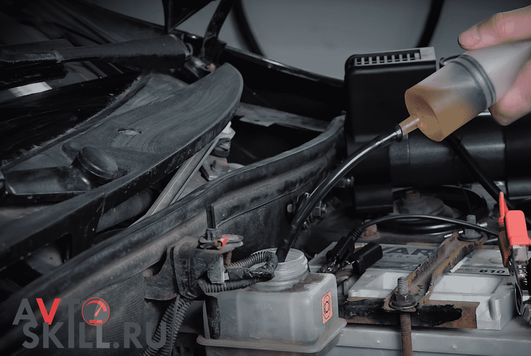 - Затем в соответствующий бачок заливаем новую ТЖ. Операцию по сливу следует повторять, пока в ёмкость не польется прозрачная жидкость.